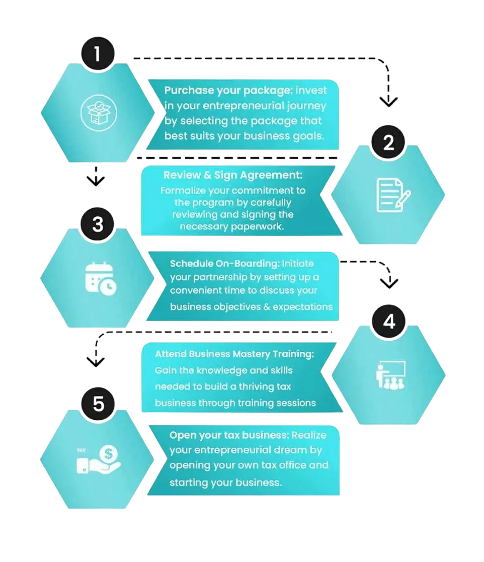 Our streamlined 5 step process guides you from choosing the perfect package to launching your thriving tax business. We’ll equip you with the knowledge, tools, and support you need to confidently file taxes for your clients and build a successful practice.